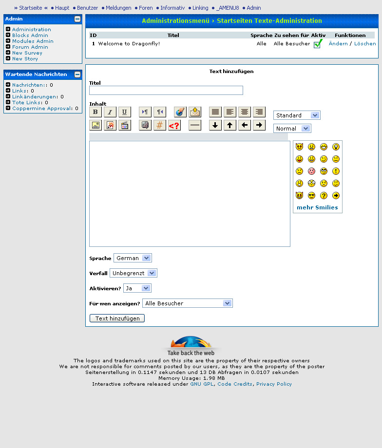 Hier werden die Texte für die Startseite eingegeben. Diese Texte sind oberhalb des in Home geladenen Modul.
