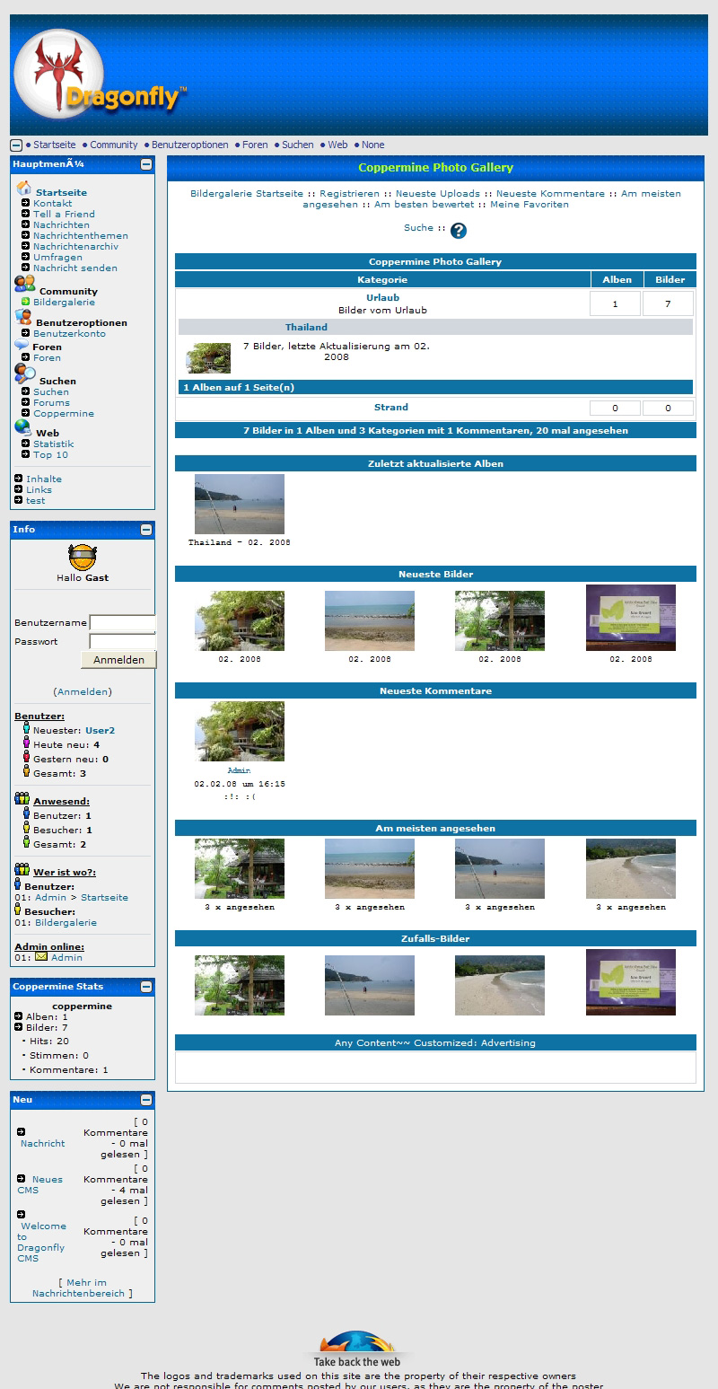 Hier sehen Sie einige Bilder / Screenshots von CPG-CMS Dragonfly CMS wie: Startseite von CPG-CMS, Einstiegs-Administrationsseite von CPG-CMS, Modulverwaltung, CPG-CMS Dragonfly Forum Verwaltung, Texte für die Startseite, News der CPG-CMS Dragonfly Webseite, Modul Coppermine Photo Gallery und Standarddesign von CPG-CMS Dragonfly.