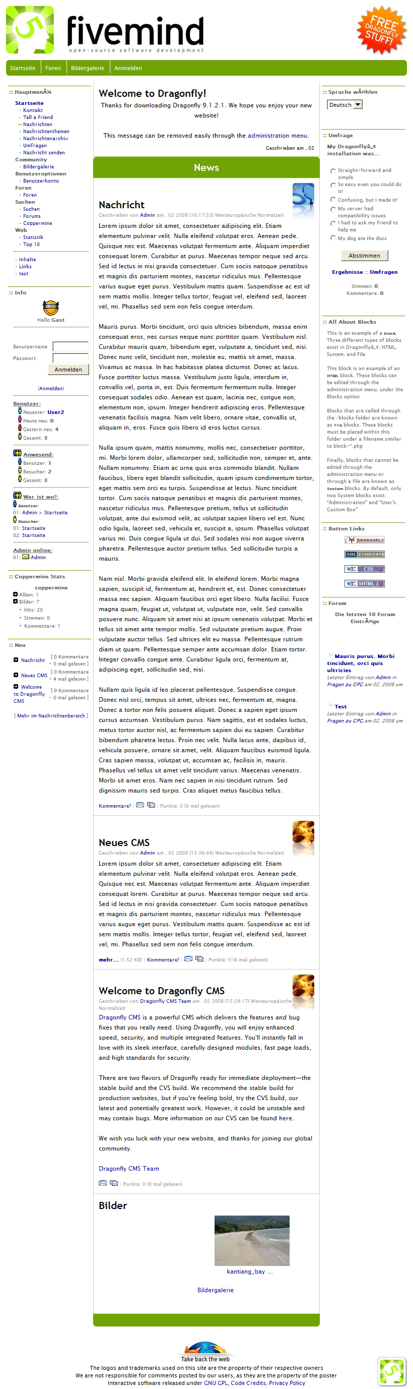 Hier sehen Sie einige Bilder / Screenshots von CPG-CMS Dragonfly CMS wie: Startseite von CPG-CMS, Einstiegs-Administrationsseite von CPG-CMS, Modulverwaltung, CPG-CMS Dragonfly Forum Verwaltung, Texte für die Startseite, News der CPG-CMS Dragonfly Webseite, Modul Coppermine Photo Gallery und Standarddesign von CPG-CMS Dragonfly.