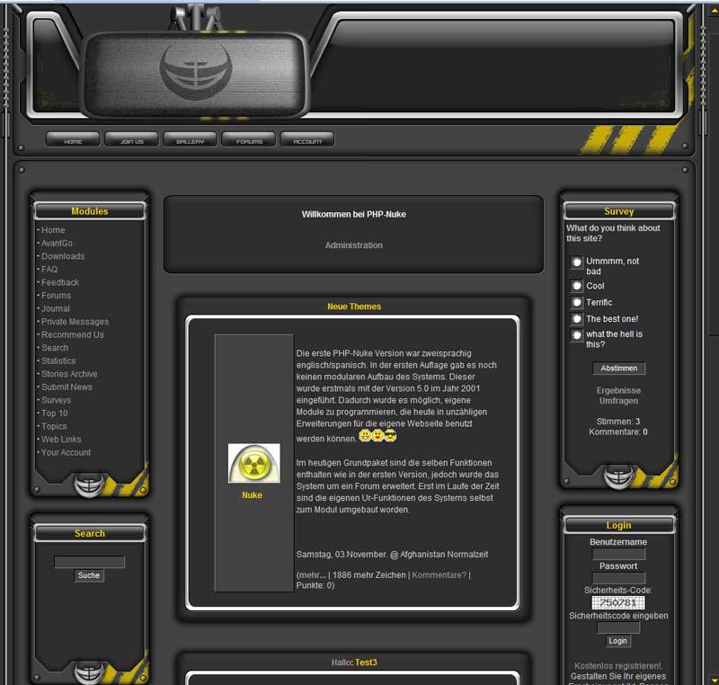 Hier sehen Sie einige Bilder / Screenshots von PHP-Nuke wie: Admin-Menü, Admin Menü Blöcke, News Menü, Newsletter System, Download-System, Admin Menü Enzyklopädie, Admin Menü – Forum – phpBB Administrieren, Admin Menü – Conten Modul und einige PHP-Nuke Themes / Layouts.