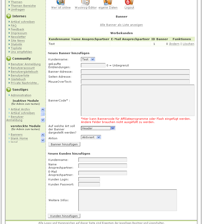 Das Banner-Modul ermöglich das einblenden diverser Banner und Werbungen auf der Webseite. Man kann diese oben, unten oder auch seitlich verschiedene Banner und HTML Codes einblenden und über das Banner-Modul verwalten.