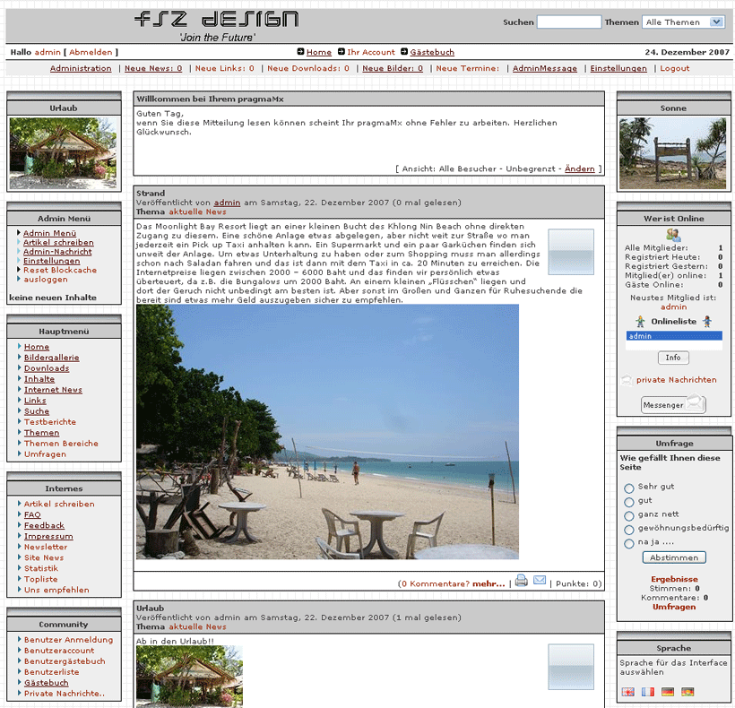 Administrationsoberfläche, Grundeinstellungen für die Webseite, Artikel Admin-Menü, Wysiwyg-Editor, Banner-Modul, Benutzergruppenverwaltung, Download-Modul, Enzyklopädie – Modul, FAQ Modul, Kontaktformular, Gästebuch Modul, Bilder Gallery Modul und einige Layouts / Themes.